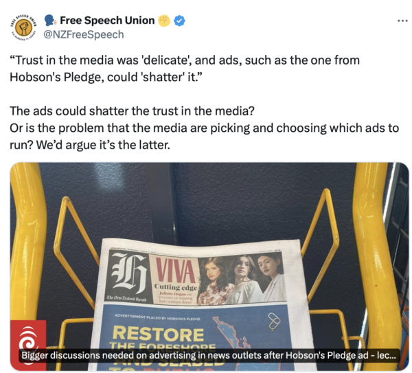 5. Advertising is an ugly feature of capitalist society. Ideally we would not have it at all, and the media would cover all issues and points of view fairly and comprehensively. However that doesn’t happen and advertising remains a last resort for progressive, democratic and humanitarian voices when they are denied access to the news and opinion sections of the media. So the same arguments for allowing freedom of opinion in publishing and broadcasting content also apply in the realm of advertising. We are all safer in a publishing environment where any opinion can be put than we would be in one where either the state or private actors can censor content. Hobson’s Pledge are a bit of a joke really. They grievously mis-translate te reo Maori, come up with “facts” which are pure invention, and use a logic which would bring shame to a five year old. Banning their fatuous advertisements accords them a status they don’t deserve and makes their opponents lazy. Neither outcome can be good for us.