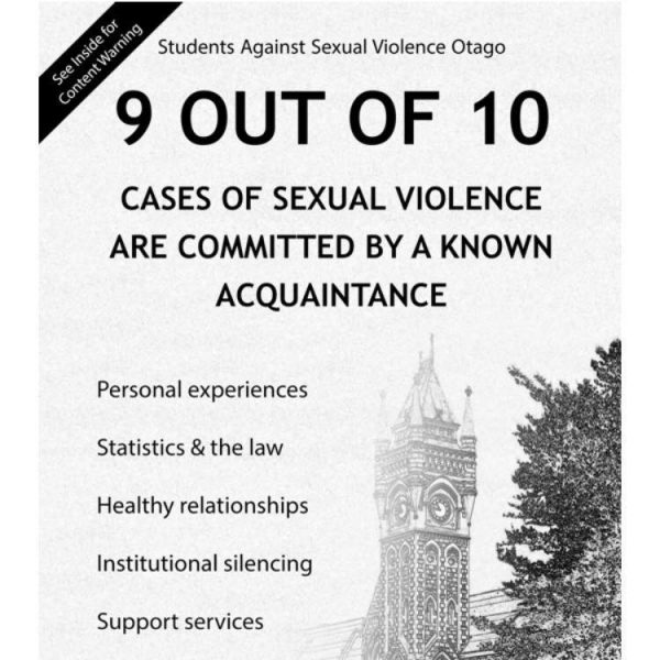 Due to intimidation by the University, an article about sexual violence which was scheduled for publication on July 31 in Critic, Otago University’s independent student magazine, was unable to be printed.Students Against Sexual Violence – Otago Uni is releasing this booklet after multiple attempts to engage politely with their University in regards to sexual violence. After very few changes having been implemented by the University, and attempts to establish policies directly addressing sexual misconduct having been delayed, under-prioritised and very little student feedback having been sought, Students Against Sexual Violence – Otago Unihas been forced to respond in this way to ensure the community meaningfully engages with this issue.