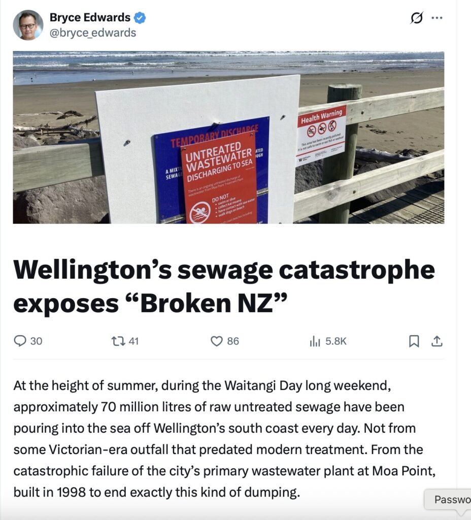 The Moa Point plant has been non-compliant with its resource consent conditions for almost every month since January 2024. Wellington Water Committee papers from December show the facility passed compliance checks in only two months out of 24. Issues included unconsented discharges, odour problems, and multiple faecal coliform exceedances. Of the four Veolia-run plants in the region, Moa Point was the only one that never achieved a single “green” rating in that period.This was not a secret. The warnings were documented, reported, and ignored.A 2021 review commissioned by Wellington Water itself painted a damning picture of the plants’ operations. It found “understaffed plants, inexperienced operators and a lack of executive oversight, leaving frontline teams to deal with complex process failures on their own.” The same review found that the contractor operating the plants, Veolia, “failed to carry out basic asset management, including regular maintenance.”Equipment was described as “obsolete and outdated and prone to failure.” Spare parts were hard to source, with long delivery times. There was “no clear responsibility for monitoring critical equipment or leading renewal programmes.”A follow-up 2023 report from engineering firm Stantec focused specifically on Moa Point and warned that the plant was “highly exposed” during upgrade work that reduced its capacity. The report predicted increased bypass events where partially treated or untreated wastewater would be discharged into the ocean.Vance noted the irony: “To layer irony onto irony, the plant meant to treat wastewater became a giant sewage geyser in the middle of an upgrade.”The catastrophe happened while they were supposedly fixing the problems.Wellington Water Committee chair Ros Connelly was blunt about what this represents: “the chickens coming home to roost after decades of underinvestment in water infrastructure.”