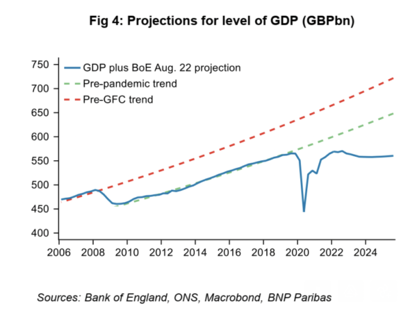 To show the scale of the long-term damage that has already accumulated, and which the central bank believes is about to be further compounded, this chart from BNP Paribas shows the current forecast compared to the trends before the Global Financial Crisis, and the comparison to the trend of growth between the GFC and the pandemic.