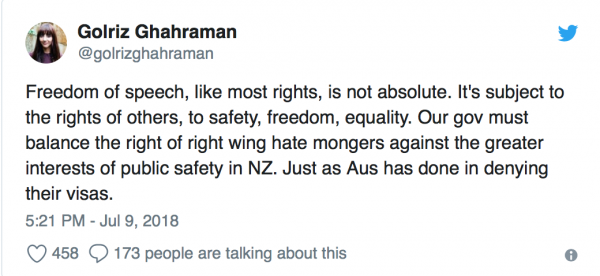 …but the hypocrisy wasn’t limited to the Right, bewilderingly and without any hint of audacity is Golriz Ghahraman defending Manning’s free speech, while denying the free speech she doesn’t like…