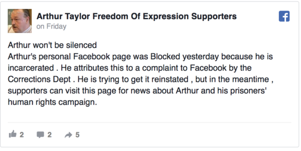 TDB Prisoner Rights blogger, Arthur Taylor has been punished by having his Facebook Page blocked by Corrections after Arthur outed a Corrections Officer for bullying…