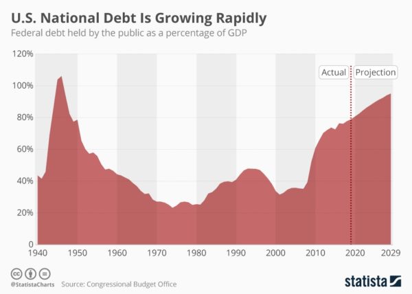 This happened to a degree with US President Trump’s tax cuts that were implemented in 2018. The resulting huge budget deficits helped push up long-term interest rates in the US and trigger mini-collapse in the stock-market in December 2018 and a decline in US industrial production in early 2019.