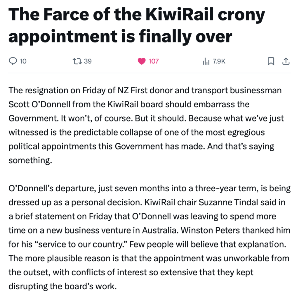 Nothing sums up the Crony capitalism of NZ First better than the appointment of a Donor with clear cut conflicts of interest to Kiwirail.