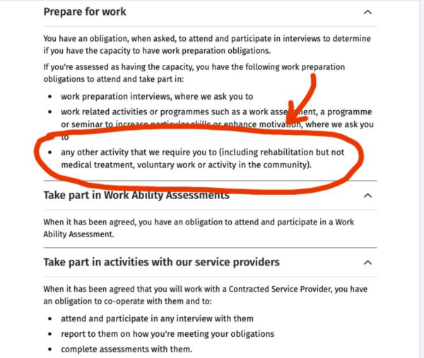 “”Any other activity that we require you to; including rehabilitation, but not medical treatment, not voluntary work and not activity in the community.”