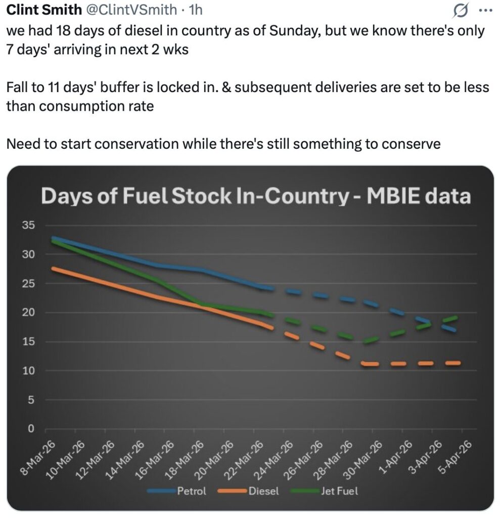 The date Luxon fears is the day NZ runs out of diesel and that date is based on when the Straits reopens.