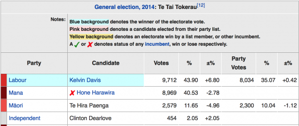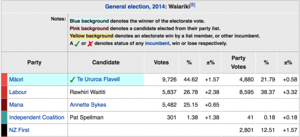 On paper Flavell romps home with votes to spare. The MANA Maori Party non aggression pact should gift him an extra 5000 votes on top of his 4000 majority, but the Jacinda effect has changed everything and Tamati Coffey has worked his butt off to get traction. The most recent poll in the Maori electorates has Labour on 46%, but in Waiariki it’s at 38% so if Waiariki moves with the trend in other Maori electorates, it will be a close election. This matters because if Flavell loses, Marama Fox and the Maori Party disappear from Parliament. Coffey has to bring out the youth vote to have a chance of unseating the great shark. NZ First gained 2801 Party votes in Waiariki, it will be interesting to see if Winston’s desire to end the Maori Electorates will damage that party vote.