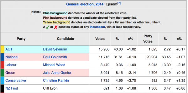 Seymour holds onto Epsom because National voters let him have it. If Green and Labour voters who waste their electorate vote on their local candidate instead used it to tactically vote for Paul Goldsmith, then National would accidentally win Epsom and Seymour would be kicked out of Parliament. Seymour’s strong support of Euthanasia has put him offside with the electorates Asian community. Where the large Conservative Party vote goes to will also impact things.