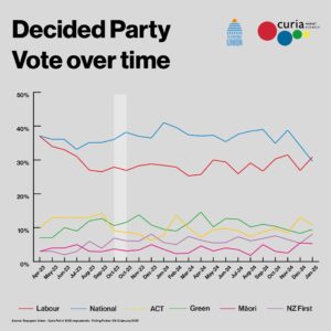 NZF – This is a very strong showing for NZF. The challenge for Winston will be in sating his new antivaxxer voter base with some damning report from the Covid Inquiry. The collision between Winston’s economic sovereignty values and the InterIslander Ferry and National’s privatisation agenda could cause an early election.