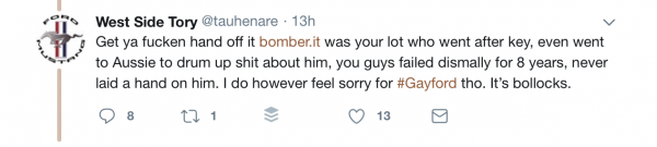 PS – As for Romeo the Sanctimonious over at The Spinoff, there is a world of difference between writing a blog, putting your name to it and stating there are rumours you can’t substantiate about a politician who was infamous for dirty politics deception, lying and deceit and this attack on a spouse. The Spinoff should stick to policing middle class micro-aggressions and cheerleading reality TV as if its culturally important.