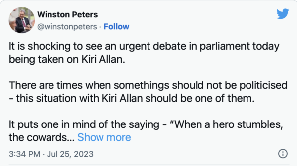 Seymour used the debate, granted by Speaker of the House Adrian Rurawhe, to both pay homage to Allan as a person but also to highlight other ministers that had resigned or been demoted, which forced Rurawhe to stop him for drifting too far from the debate’s topic – the resignation – because he was using his time to criticise the Government.