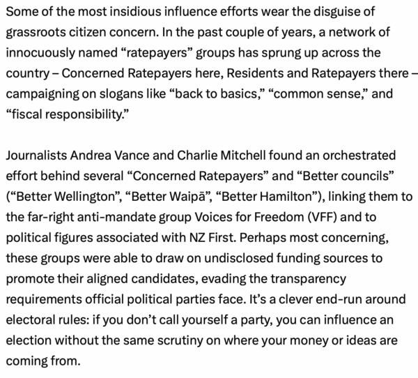 Bryce Edwards makes the point that Local Elections are utterly dominated by the polluter industry using astroturf organisations to trick you into voting for them…
