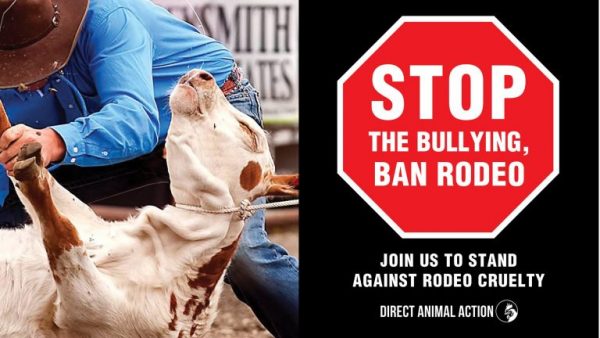 The group Direct Animal Action will hold large ‘STOP’ signs at the entrance of the event, calling on the new Government to stop rodeo by banning it in New Zealand.