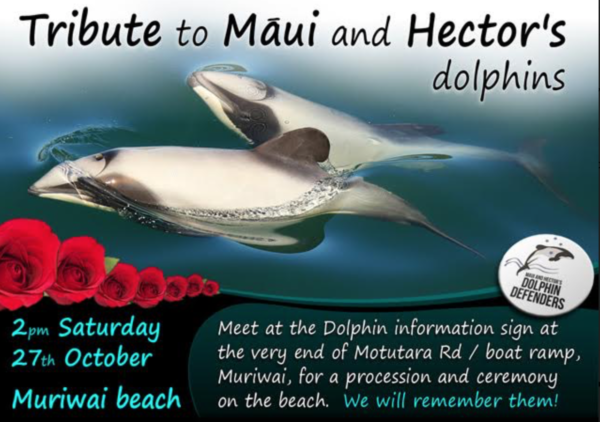 Māui and Hector’s Dolphin Defenders NZ Inc are organising this tribute to honour and observe the loss of a pregnant Māui dolphin mother and calf three weeks ago off the North Island West Coast; five Hector’s dolphins killed in a net near Christchurch earlier this year, and at least fifteen Māui and Hector’s reported dead this year already.