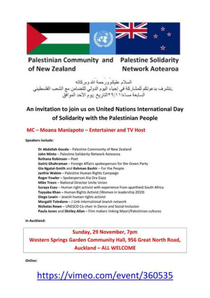 The Palestine Solidarity Network Aotearoa and the Palestine Community of New Zealand are celebrating UN International Day of Solidarity with the Palestinian People tomorrow with an event in Auckland featuring entertainer and TV host Moana Maniapoto as MC and a performance by renowned New Zealand musician Tigi Ness from Unity Pacific. (Tigi will be singing “We are all Palestinians” from Unity Pacific’s “Blackbirder Dread” album. This marvellous song can be heard here)