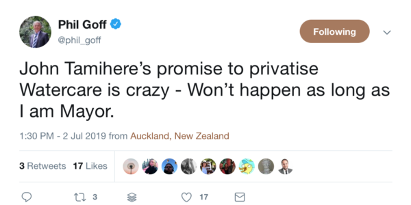 John Tamihere would get more traction if he wanted to rid the council and COO of all the corruption and wasting of money and hold them accountable… it’s not a policy winner to try to sell of water care for voters… quite the opposite, helping Phil Goff to stay.