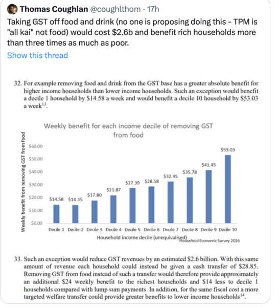 Australia don’t have GST on food and they own half our fucking Supermarket Industry so let’s not pretend they can’t simply remove it and we are only one of 3 countries that tax food like this.
