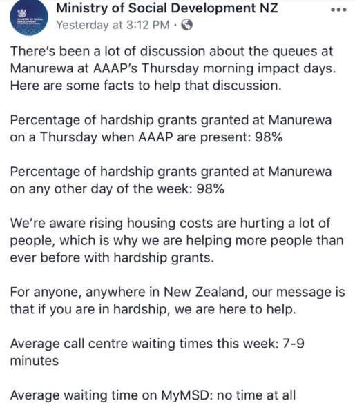 Blaming AAAP for the fact beneficiaries are prepared to cue at 2am in the freeing rain because they will do anything humanly possible to have an advocate guide them through the dehumanising and toxic culture inside WINZ is victim blaming in the extreme.