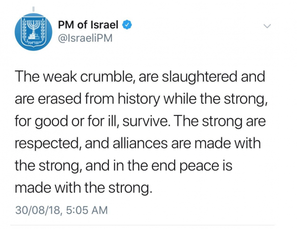 But- speaking at a recent event held at an Israeli nuclear research facility, Israel’s Prime Minster, Benjamin Netanyahu, in remarks made to patently intimidate Iran, broke with the above tradition by suggesting that the strong would survive while the weak were slaughtered and erased from history.