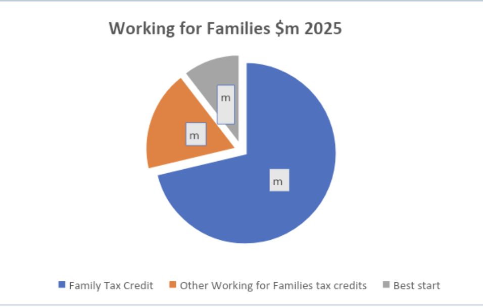 First let’s get WFF into persepctive. Of the total 2024/25 cost of WFF, $3.2 billion, over 70% is the FamilyTax Credit, a weekly per child payment that applies to all low income children. This is the tool that is best suited to tackling child poverty and shown in blue segment of PIE chart.