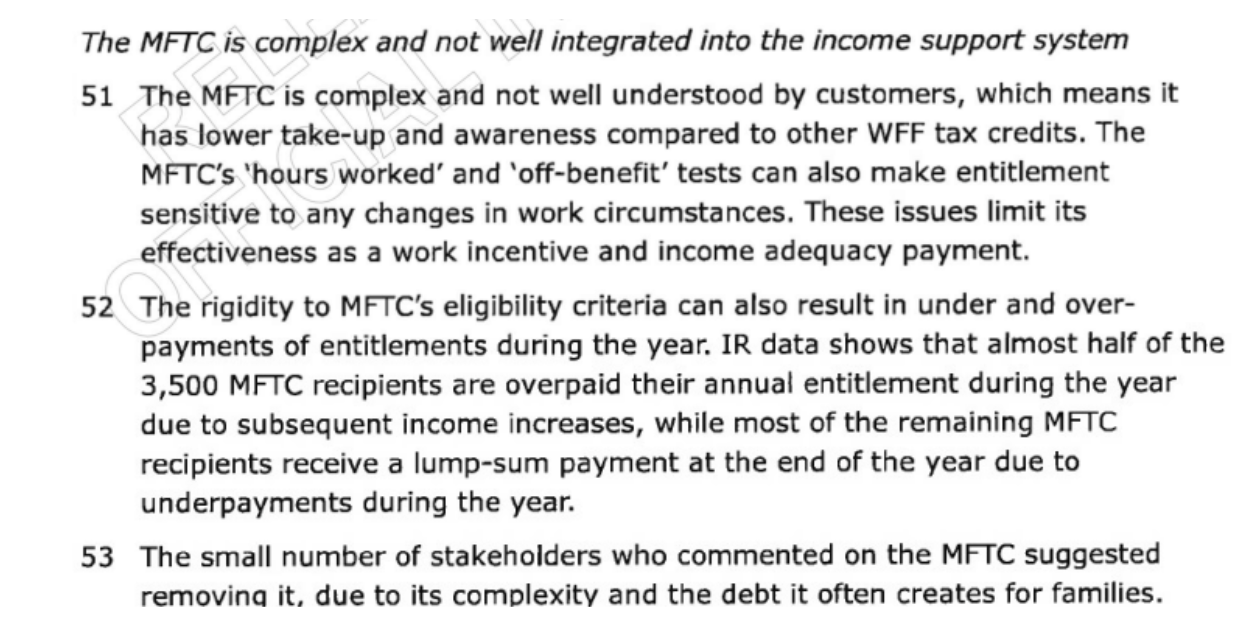 Remember around only 3000 families are eligible for the MFTC, compared to the 350,000 families who get one or more of the main WFF tax credits (FTC, IWTC and Best Start)