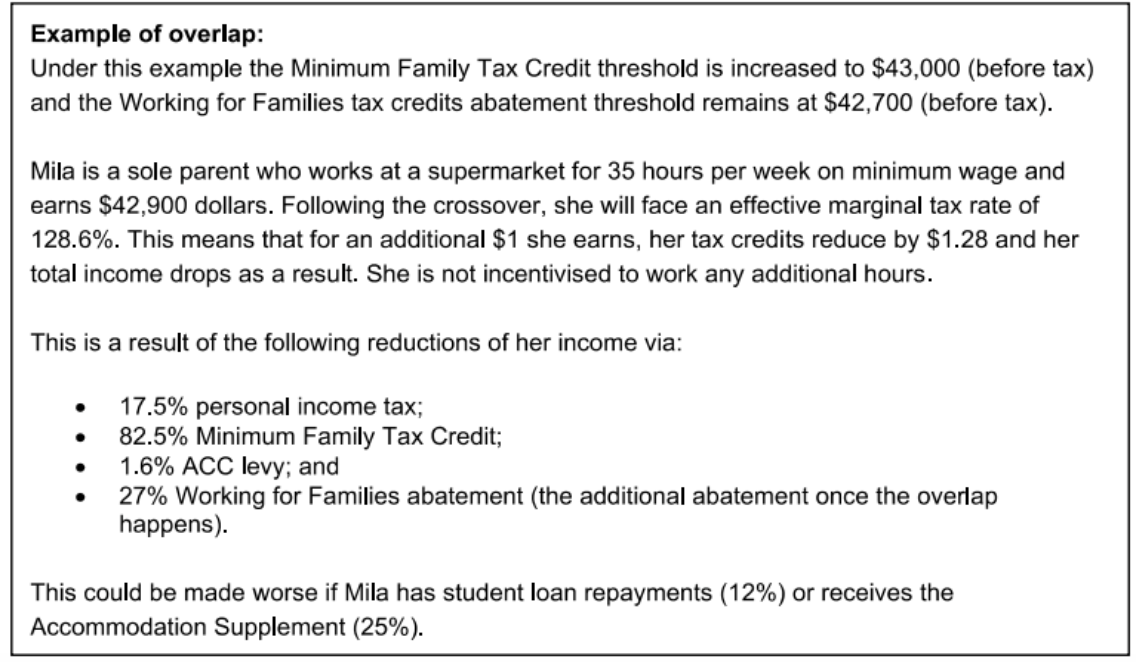 Oh, and let’s not forget the pathetic attempt to make work pay with Minimum Family Tax Credit (MFTC). A family has to be both off the benefit and meeting fixed hours of work to have their incomes topped by the IRD with this oxymoron of a work incentive. The MFTC can be a very significant state payment worth more than a part welfare benefit, however as it is paid by the IRD is not called a benefit, therefore the family can have the IWTC too. As if it couldn’t get more bizarrely convoluted, this ‘work incentive’ MFTC has a 101.3% abatement- so the family makes itself worse off by working more.