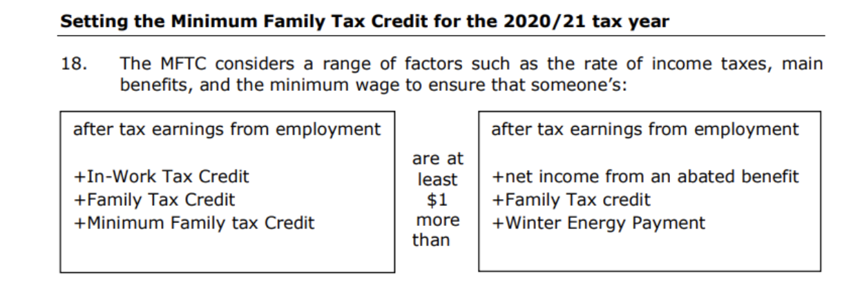 The thing is that the MFTC is not a fixed amount for all families but is a top up to ensure that incomes do not fall below the MFTC threshold of $677 a week after tax, (or $798 gross income).