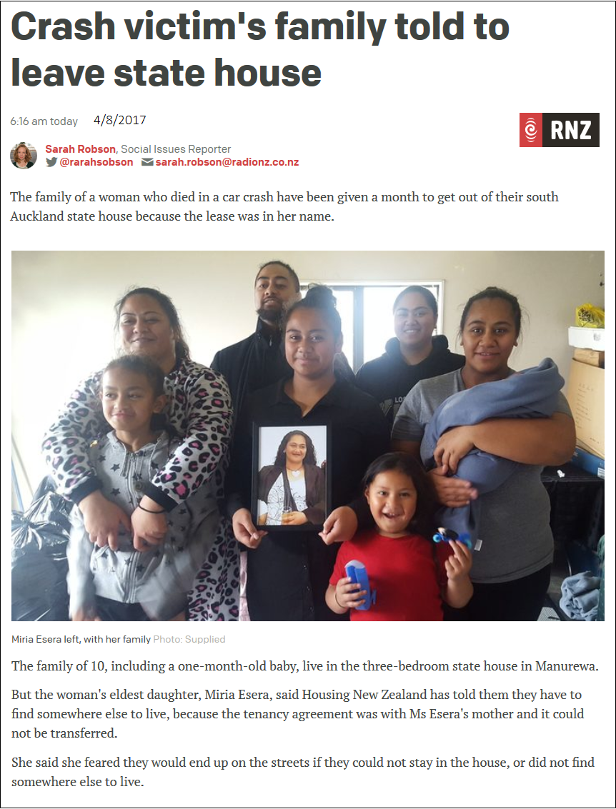 Radio NZ: Crash victim’s family told to leave state house