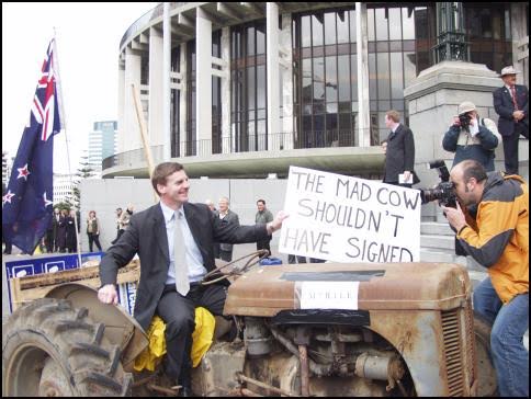 For Labour cabinet ministers to back away from practical, equitable, and long overdue solutions to serious environmental problems, all the farming community has to do is show up outside Parliament and drive a rusty tractor up its front steps. [And yes, that is indeed Bill English behind the wheel, and the mad cow jibe on the placard he is holding up for the news media is aimed directly at the prime minister, Helen Clark. – C.T.]