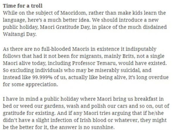 The columnist, who once bragged about goading a protester into committing suicide in what was the NZ Herald’s only snuff column, has decided that NZ isn’t racist enough and has penned a truly offensive evaluation of Waitangi Day.