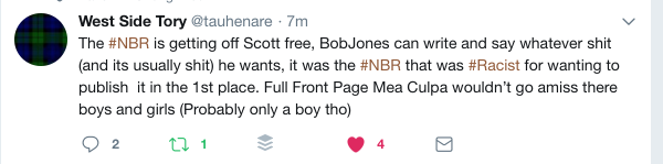 If the NBR believes, hand-on-heart, that free speech was well served by publishing Jones’ incoherent racist rant – might I offer up some scribblings copied directly from public toilet walls? After all, it appears that free speech on the NBR is not tempered by employing common sense or self-discipline of any description.