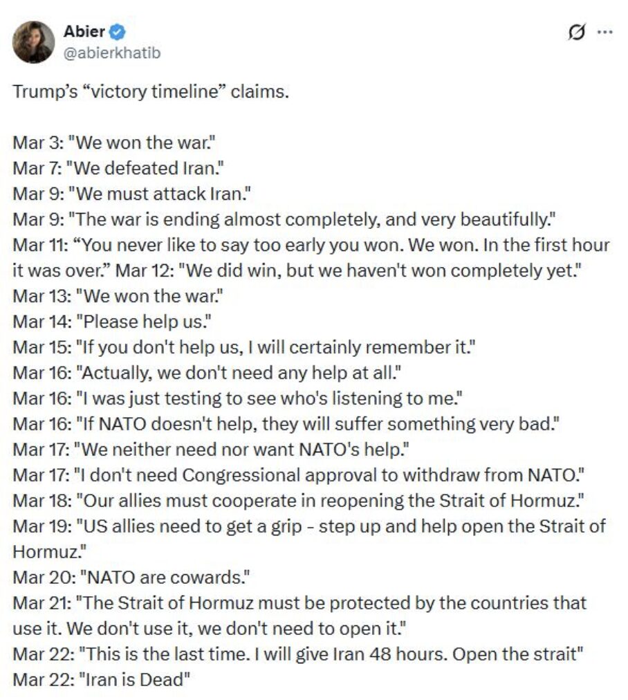 NONE of Trump’s daily changing reasons why he and Israel had to start an illegal war, bomb schools, start a global energy crisis, commit war crimes, threaten more war crimes and then promise genocide have been met.