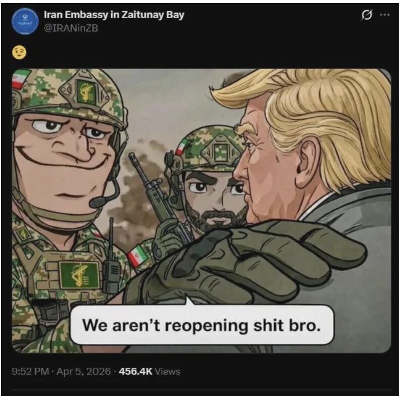 Here’s the hope. That by strangling off the Strait, Iran can now leverage America into paying for the damage they caused plus a lifting of sanctions because ultimately the only way the Theocracy loses its grip on Iranian society is if it becomes prosperous in its own right.