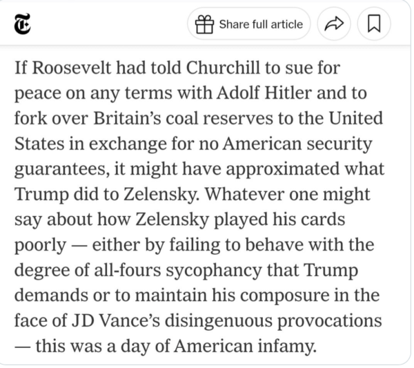 I will take that as a compliment from TDB. For clarification: It might have seemed that I was criticising Mr Zelenksy here. Well, he is certainly not above criticism, but my real point was about the way Donald Trump perceives the world (Zelensky as a naughty child) and the way he behaves (with contempt). Moreover, it is not just about Trump. There is a consistency to the way in which the US has treated its friends, allies and enemies with an equal measure of contempt unless they have the power to resist US ambitions. Along with this consistent element of US foreign policy there is a trend evident towards an increasingly brazen and crude implementation of the policy, culminating in Donald Trump.