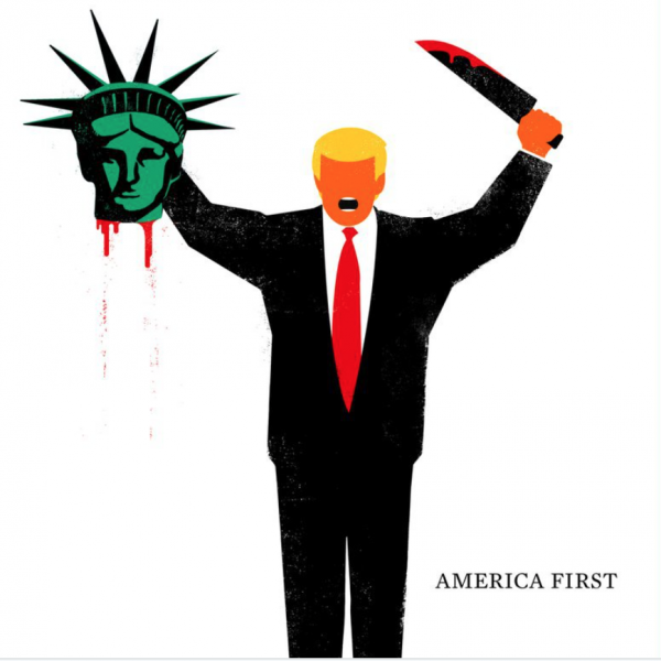 I like that image and think it conveys a very powerful message. The few colours used and the paint-roller effect gives it such a boldness. And the lack of eyes; the unmistakable, symmetrical black-hole mouth, with the same blackness as his suit and the knife; and bringing out the orange of Trump’s skin into red-orange – it conveys a symbol of rage. Even the way his arms are raised has the look of someone violently frightening others; and the posture as a whole demonstrates a kind of immobilized, almost robotic-insane, rage. I think it tells a blazing story; a very well done image.