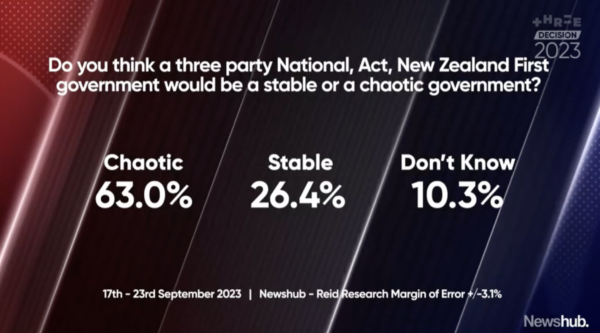 That 63% saying it will be chaos is largely due to Seymours unhinged behaviour toward NZF. Here’s hoping its a Nats/NZF Coalition or that Seymour is only doing this to sway voters from NZF so he doesnt have to compete with him. Hopefully he can put away his theatrics and get on and govern with NZF or its going to be a short govt. So the question of the day is – Is Seymour a nut or Is he just playing? Or both?