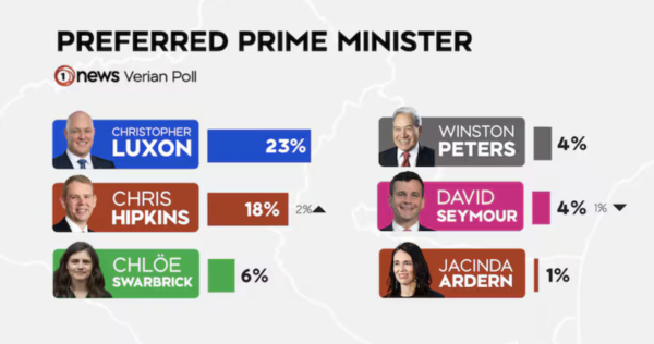 Luxon: His wooden C3P0 routine mixed with his dork Dad routine mixed with his butch tough guy to compensate for Winston and Seymour overshadowing him routine mixed with his losing his temper at media for being challenged routine seems to be wearing thin on voters. Despite National going up, he flatlines.