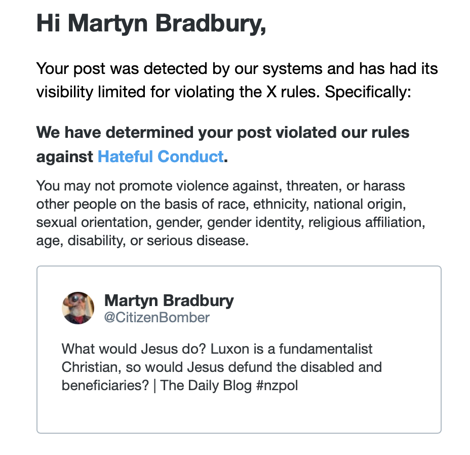 This is disgraceful censorship from people who proclaim themselves to be fundamentalist free speech advocates. Martyn’s offense was to be make a valid political point all too well. Luxon and his cronies are digging their own grave. If Luxon has an ounce of sense he will have the X ban on Martyn’s post lifted immediately. But so far in his political career he has displayed little wisdom or even political common sense.