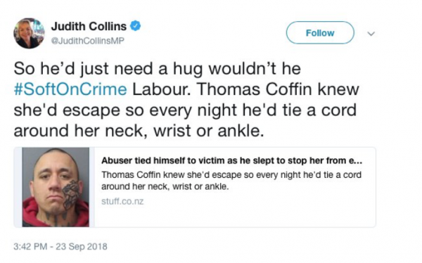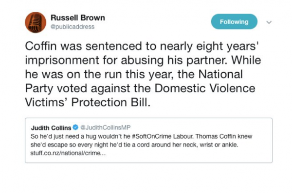 …unfortunately for Judith, as Russell Brown devastatingly pointed out, National actually voted down the Domestic Violence Victim’s Protection Bill that allows victims of the very type of abuse Thomas Coffin was convicted of to take time off work so they could escape and deal with their domestic abuse…