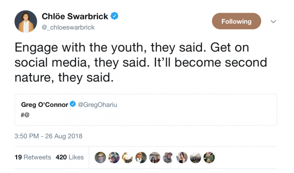 Well, I know who Greg O’Connor is. But who’s Chloe Swarbrick? And hasn’t she got something important to be doing?