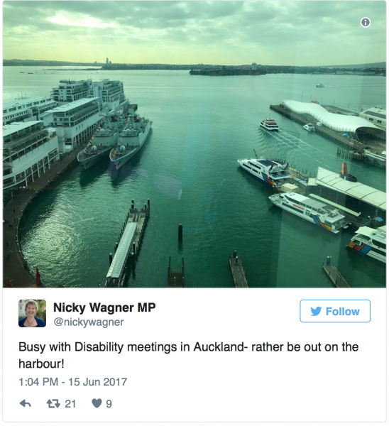 Nothing sums up the born to rule contempt that National embody better than this tweet by the Minister for Disability. Here she is supposedly at work having a meeting on disability issues and she’s posting glorious photos of the harbour wishing she could dump this disability crap and party on the water front.