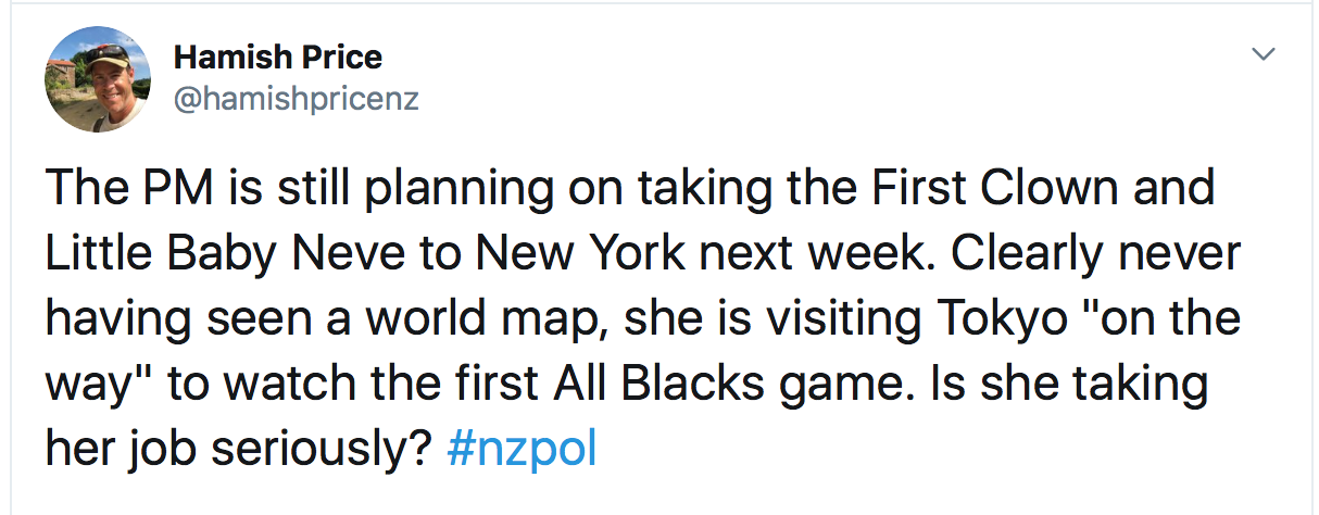 Hamish Price … bit below the belt to nastily attack the PM’s family. If I remember correctly, when John Key was PM, wasn’t the order of the day “hands off his family”? Fair enough. Same respect please for Jacinda Ardern’s family too.