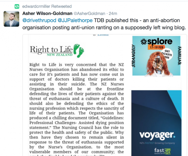 …you’ll note this was published in the raw news feed of TDB, that’s where TDB automatically posts press releases from a range of different groups. Publishing a press release is not even close to endorsing or supporting that post, it’s done as a service to the news reading audience of TDB to see what different press releases are saying that day. Bloody Scoop, their cherished Wellington Media Bastion of Journalism PUBLISHED THE SAME BLOODY PRESS RELEASE. Are these Wellington Twitteratti screaming at Scoop?