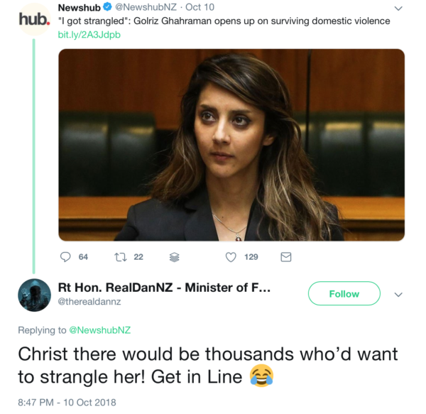 Like many other women online, Golriz has had to endure bile in the past, attempts to attack her CV and her refugee status have always been pretty gross but the recent cruelty and ugly hate spat at her for acknowledging domestic violence used against her in a relationship was so fucking cruel and utterly unnecessary it really made me question basic humanity.