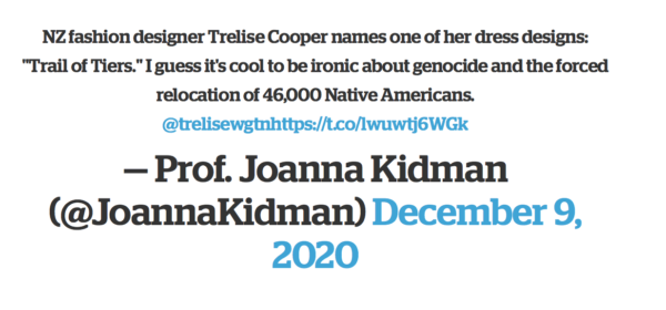 +100% on all three points made here, namely: TC is ignorant, academics are myopic, there are WAY more pressing issues to wave a stick at and feel righteous doing it. Though to be fair it is a fucked up name to reference a dress and was TC really unaware of the meaning and did she use it anyway, after all it’s not the first time she has appropriated American Indian cultural references. That really would be beyond ignorant if that was the case though.