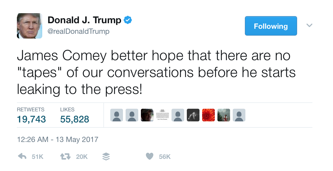 Trump tweeted: “James Comey better hope that there are no ‘tapes’ of our conversations before he starts leaking to the press!”