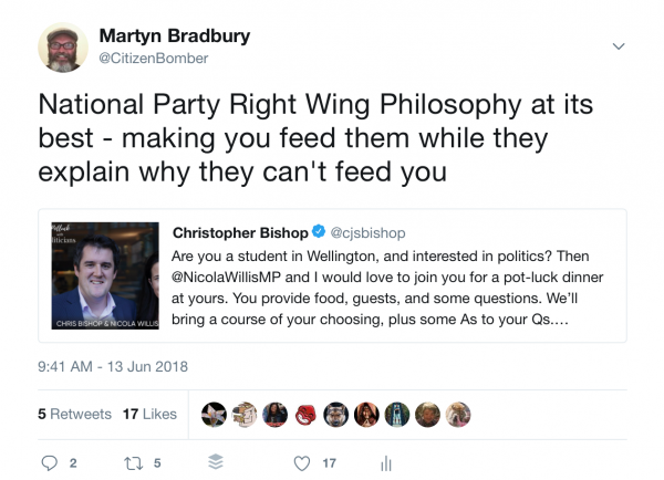 National Party scabs Chris Bishop and Nicola Willis want Wellington students to give them some food to appear at their dinner…