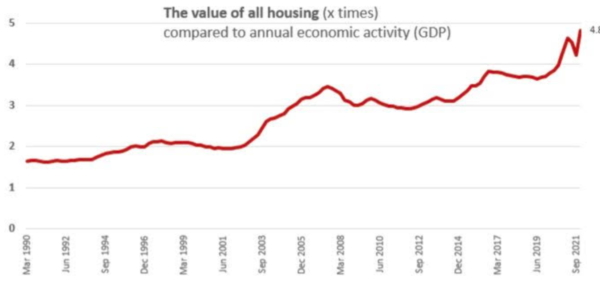 In Aotearoa this inevitably will include housing debt. At the moment housing values equal about 4.8 times our total economic activity as measured by Gross Domestic Product. This compares to 1.7 times in the US.