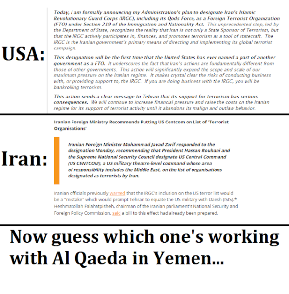 Right, so here’s Iran’s Foreign Minister briefly providing a bit of perspective upon what’s gone on here with the US’s designation of the Iranian Revolutionary Guard as a “terrorist organization”.