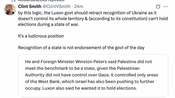 This has occurred because David Seymour has built an illegal settlement on the Prime Minister’s balls and we all have to pretend that is an independent foreign policy.